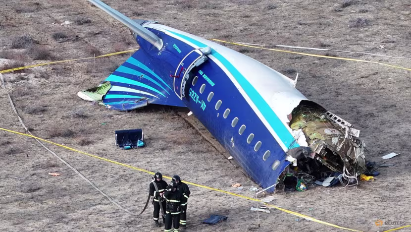 Front Page: A drone view shows emergency specialists working at the crash site of an Azerbaijan Airlines passenger plane near the city of Aktau, Kazakhstan, on Dec. 25, 2024. Photo: Reuters/Azamat Sarsenbayev and published by CNA